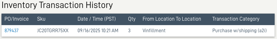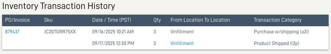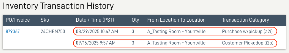 To view the inventory transaction history of a single order, view the Order Detail and scroll to the bottom of the page, below the invoice details.