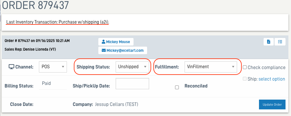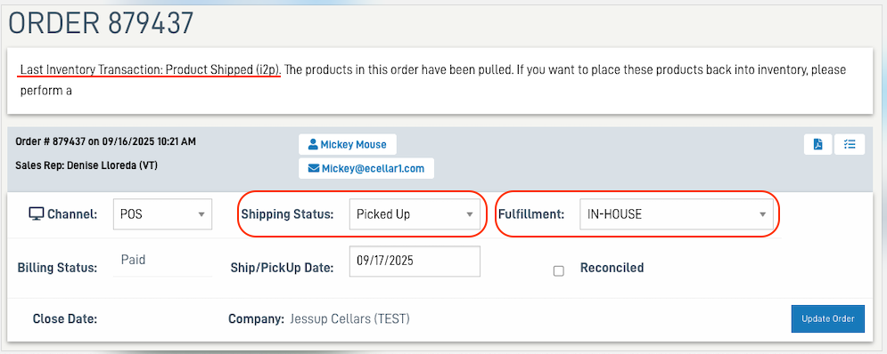 If the shipping status is changed to Picked Up, even if the Fulfillment setting is changed to In-House to represent a tasting room, the next inventory transaction will adhere to the original settings and the will be Product Shipped (i2p) from Vinfillment, not the tasting room.