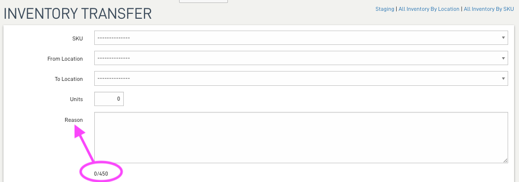 - Inventory > Admin > Transfer and Adjustments > Reasons field now stops at 450 characters and includes a live counter