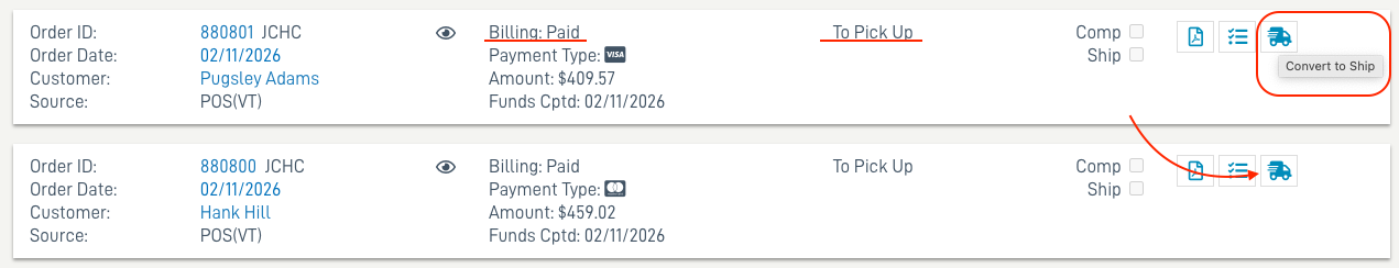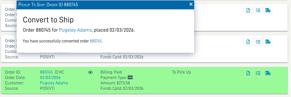 An order eligible for conversion from To Pick Up to Unshipped or Hold Ship will have a truck icon for Convert to Ship.