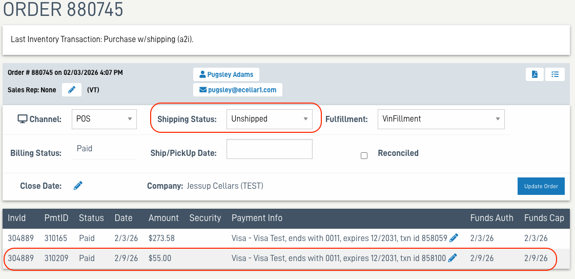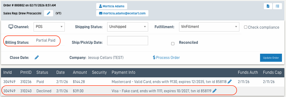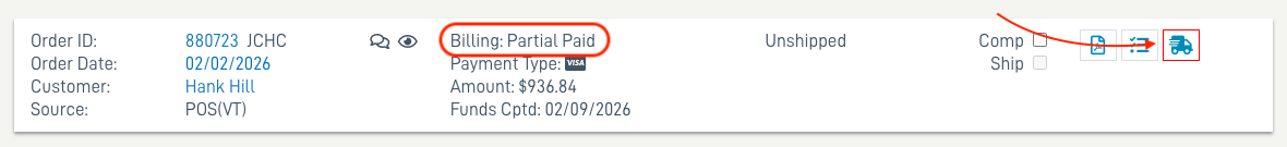 - In the Order Detail the Billing status will update to Partial Paid.