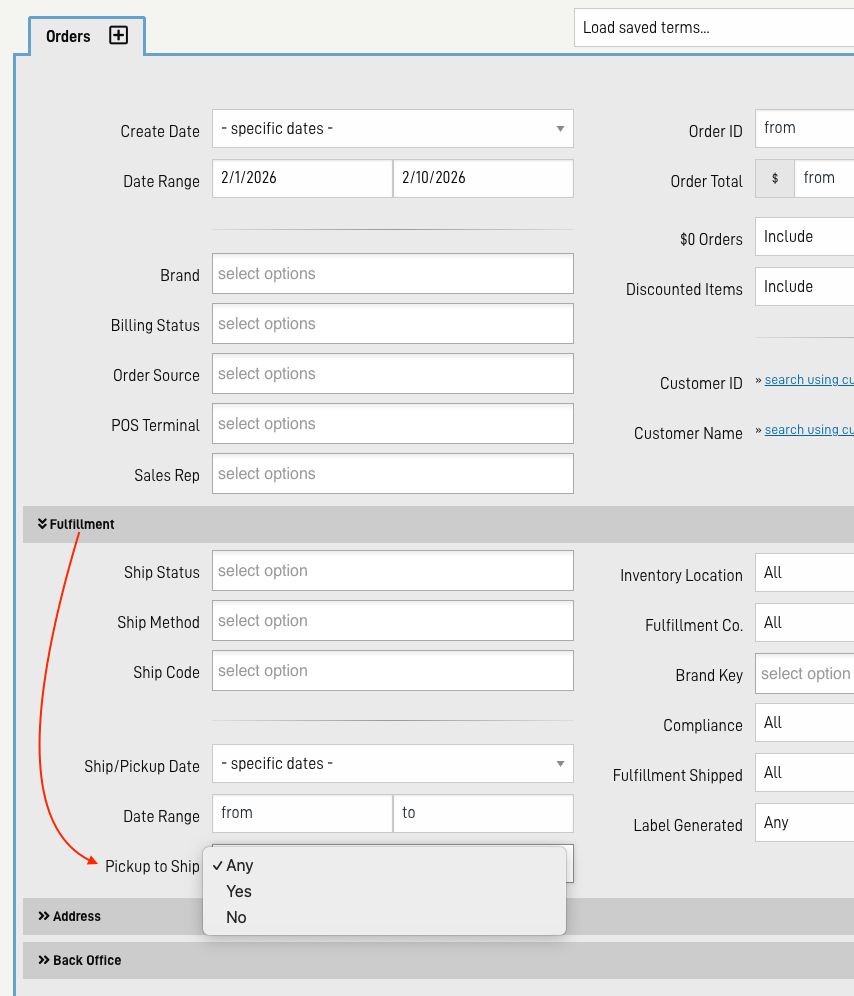 - In the Order Search form, under the Fulfillment tab find the Pickup to Ship field.