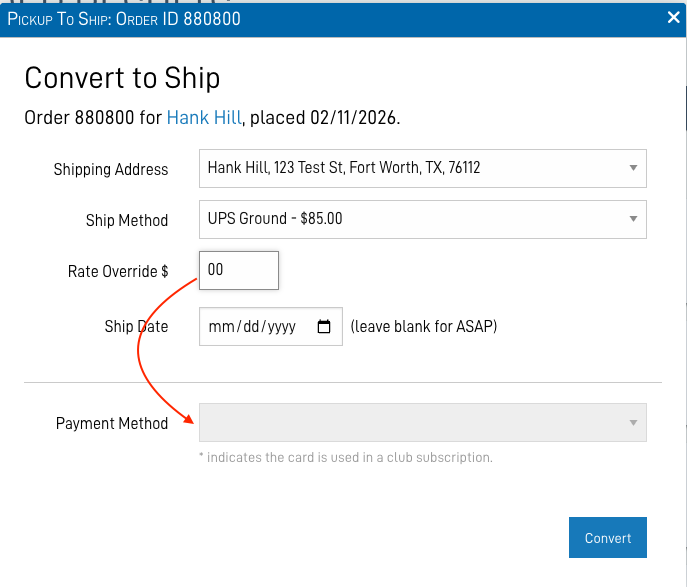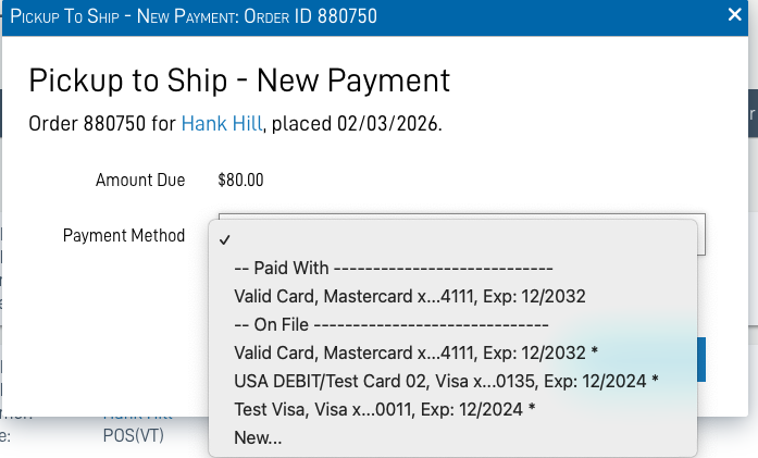 If there are no payment methods available (I.E.: The original pickup order was paid in cash), there will be a link to create one, rather than a drop-down menu. (A payment method will be required from the customer.)
