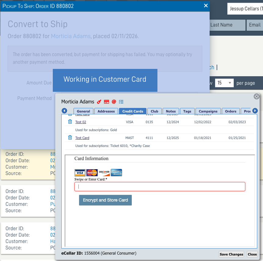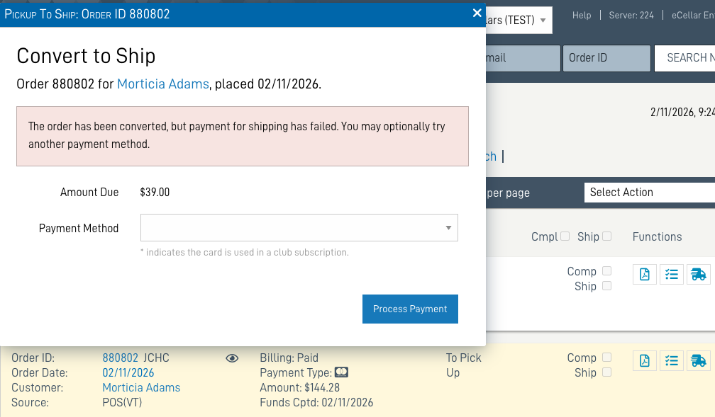 Invalid/Declined Payment results in a message: The order has been converted to SHIP, but payment for shipping has failed.