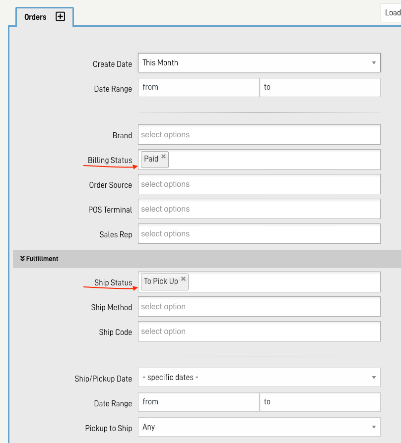 Billing status = Paid, Shipping status = To Pick up, optional date frame, or order source, or other segmentation.