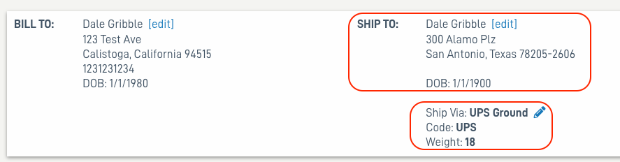 The shipping address is updated, and shipping information added.