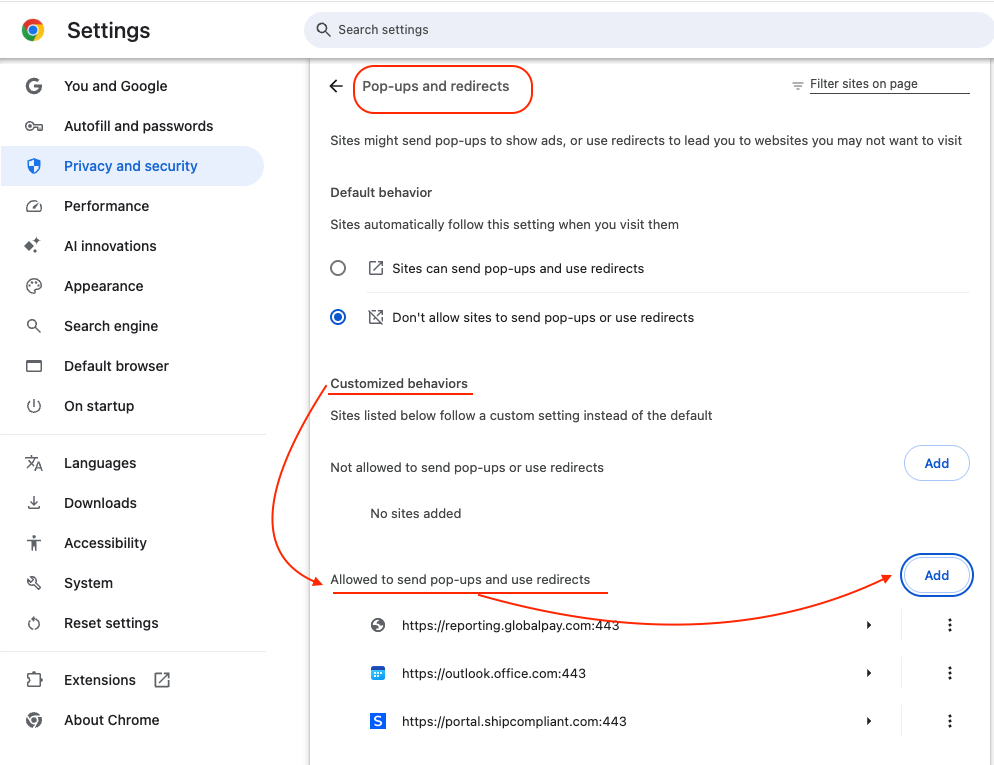 - Select Pop-ups and redirects
